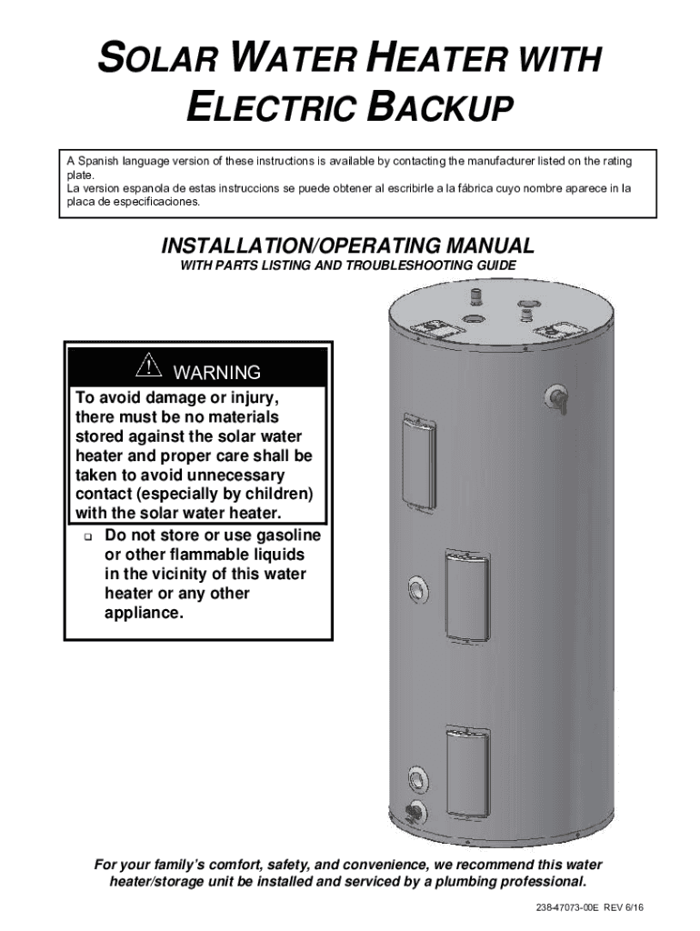 SOLAR WATER HEATER WITH ELECTRIC BACKUP A Spanish language version of these instructions is available by contacting the manufacturer listed on the rating plate. La version espanola de estas instruccions