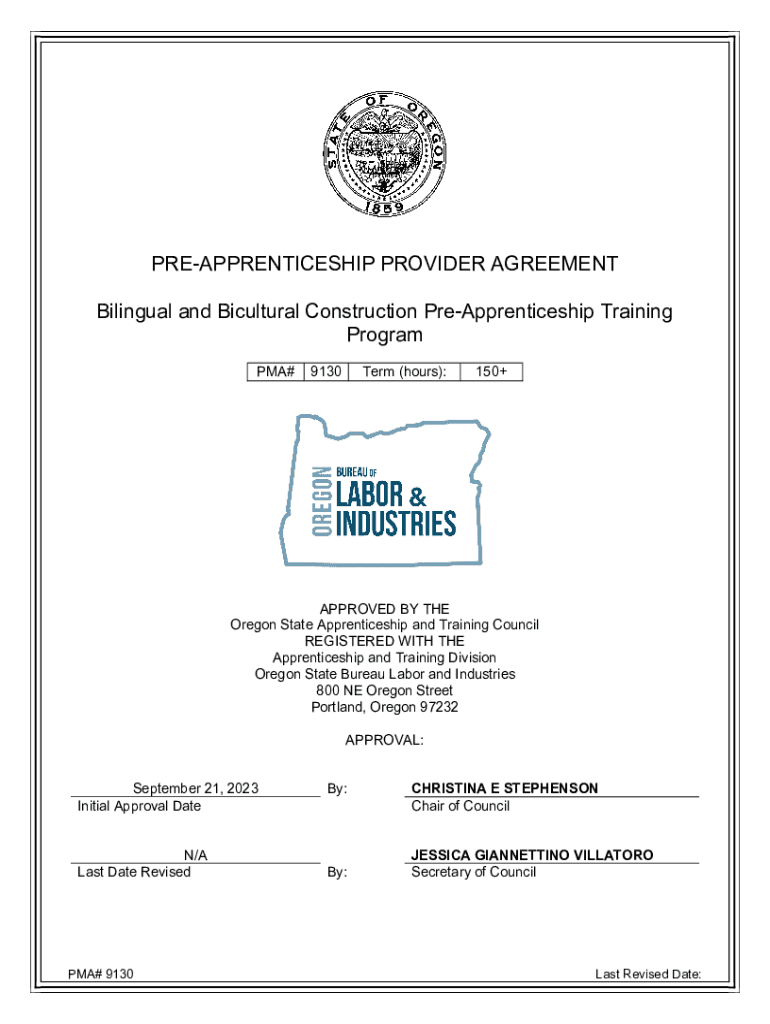 PREAPPRENTICESHIP PROVIDER AGREEMENT Bilingual and Bicultural Construction PreApprenticeship Training Program PMA#9130Term (hours):150+APPROVED BY THE Oregon State Apprenticeship and Training Council
