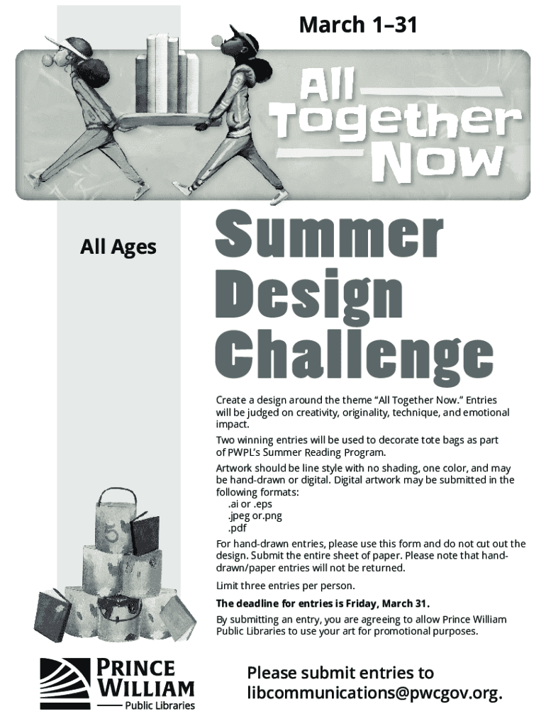 March 131All AgesSummer Design ChallengeCreate a design around the theme All Together Now. Entries will be judged on creativity, originality, technique, and emotional impact. Two winning entries will