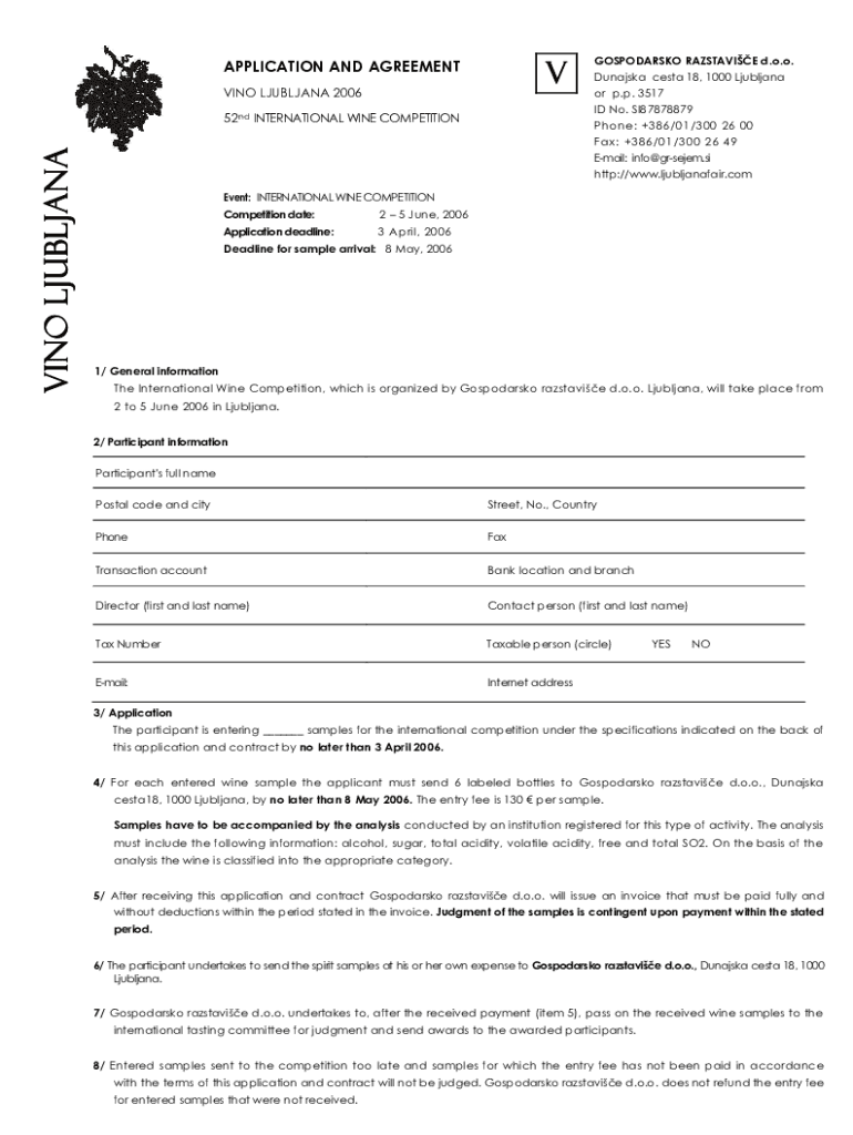 VAPPLICATION AND AGREEMENT VINO LJUBLJANA 2006Dunajska cesta 18, 1000 Ljubljana or p.p. 3517 ID No. SI8787887952nd INTERNATIONAL WINE COMPETITIONVINO LJUBLJANAGOSPODARSKO RAZSTAVIE d.o.o.Phone: +386/01/300