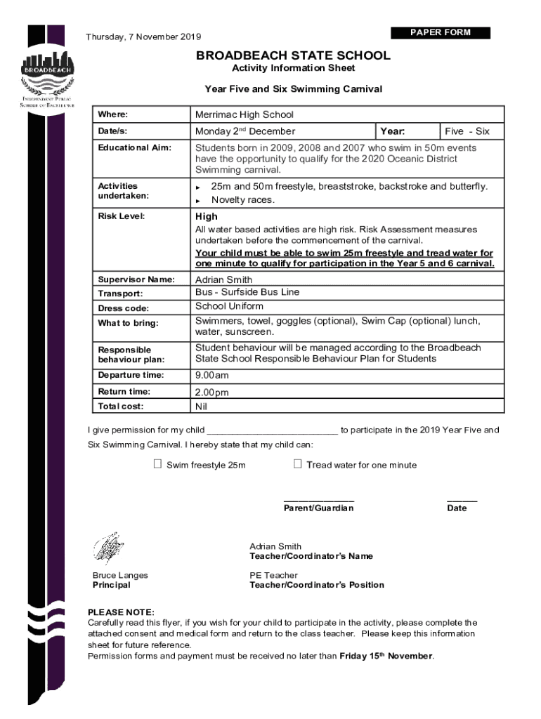 Get the free 5-6 Swim Carnival - Activity Information Sheet and Consent ... - broadbeachss eq edu