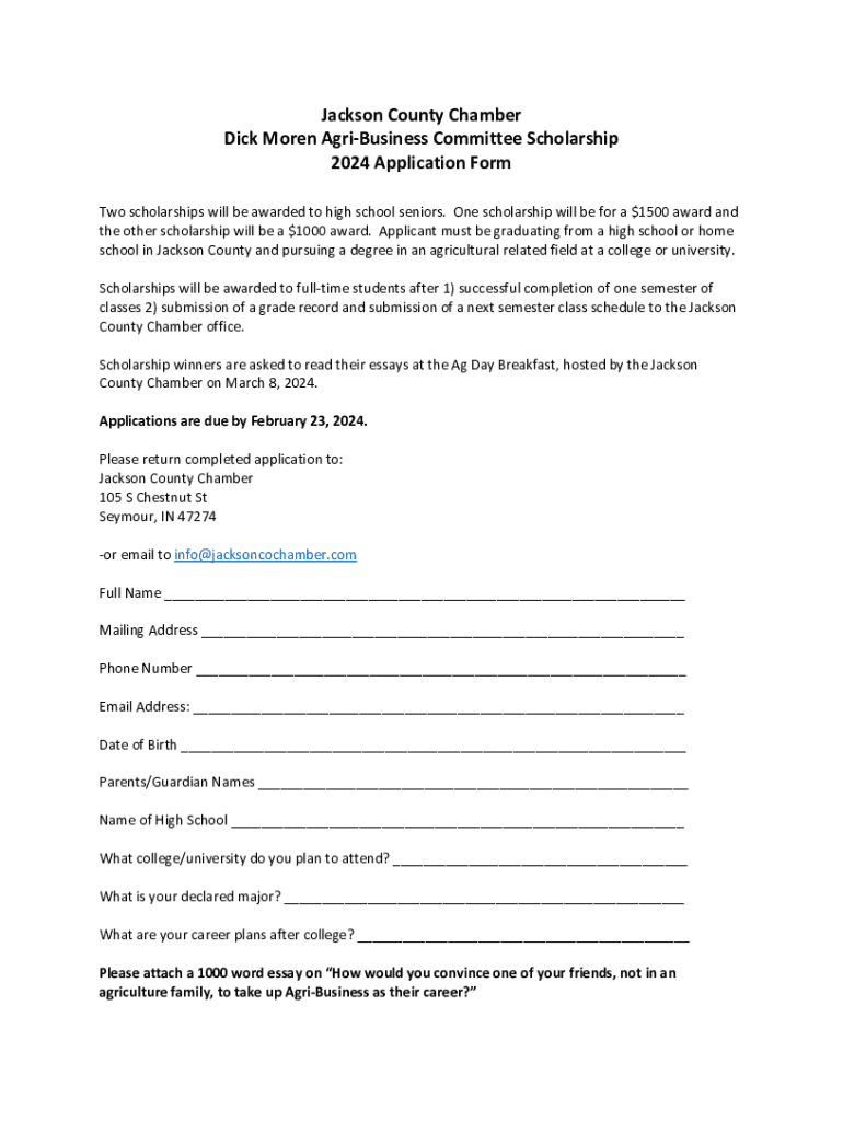 Jackson County Chamber Dick Moren AgriBusiness Committee Scholarship 2024 Application Form Two scholarships will be awarded to high school seniors. One scholarship will be for a $1500 award and the