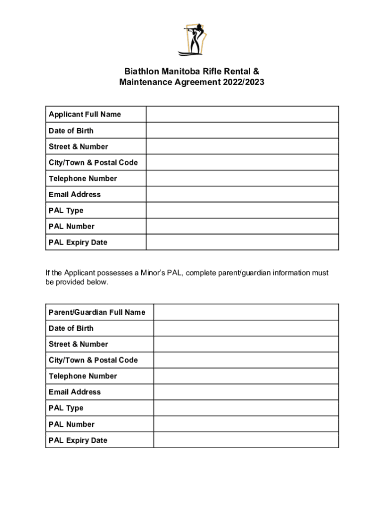 Biathlon Manitoba Rifle Rental & Maintenance Agreement 2022/2023Applicant Full Name Date of Birth Street & Number City/Town & Postal Code Telephone Number Email Address PAL Type PAL Number PAL Expiry