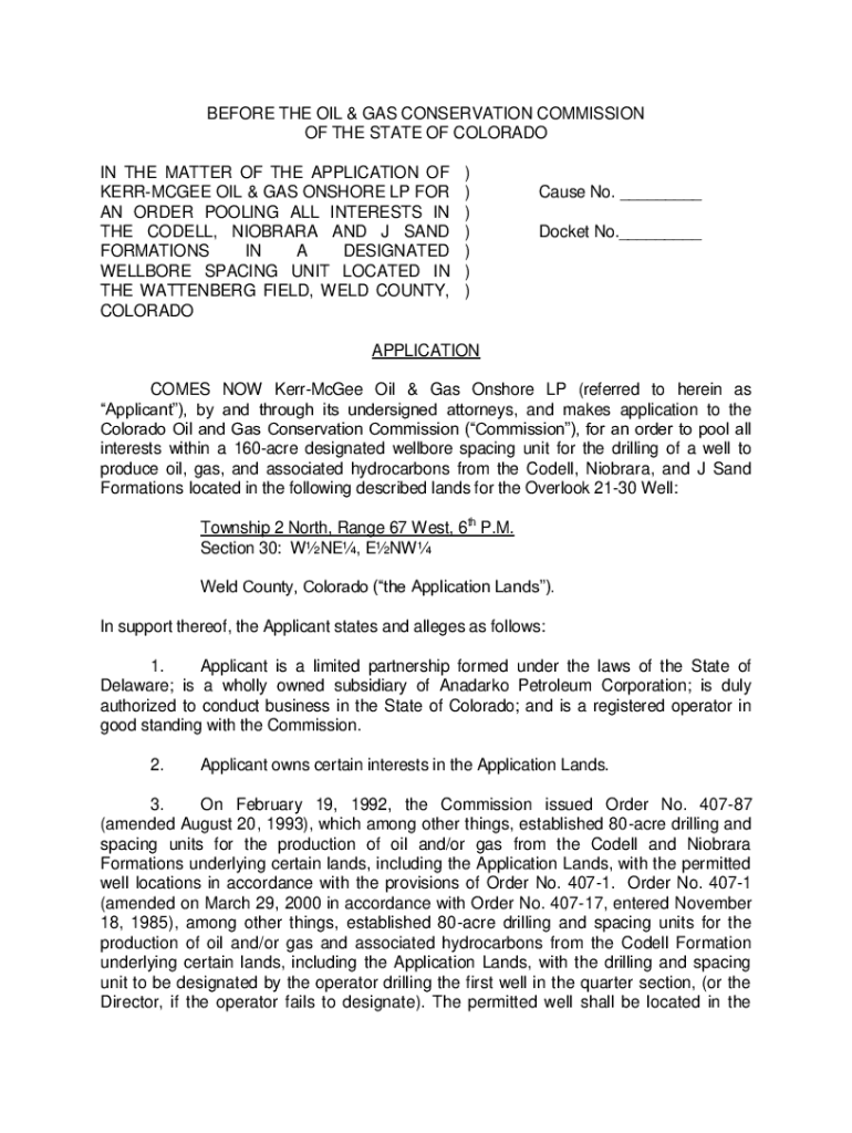 BEFORE THE OIL & GAS CONSERVATION COMMISSION OF THE STATE OF COLORADO IN THE MATTER OF THE APPLICATION OF KERRMCGEE OIL & GAS ONSHORE LP FOR AN ORDER POOLING ALL INTERESTS IN THE CODELL, NIOBRARA