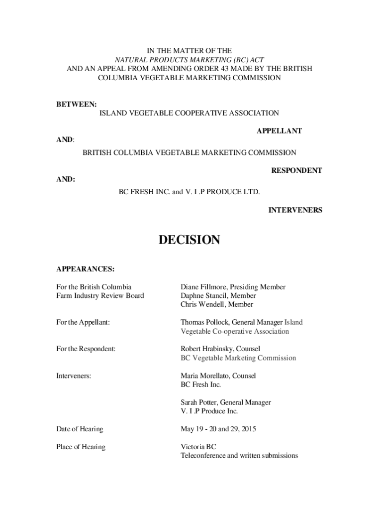 IN THE MATTER OF THE NATURAL PRODUCTS MARKETING (BC) ACT AND AN APPEAL FROM AMENDING ORDER 43 MADE BY THE BRITISH COLUMBIA VEGETABLE MARKETING COMMISSIONBETWEEN: ISLAND VEGETABLE COOPERATIVE ASSOCIATION