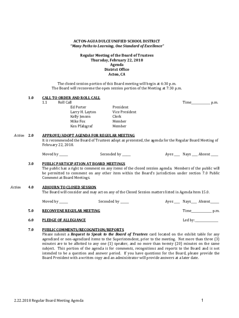 ACTONAGUA DULCE UNIFIED SCHOOL DISTRICT Many Paths to Learning, One Standard of Excellence Regular Meeting of the Board of Trustees Thursday, February 22, 2018 Agenda District Office Acton, CA The