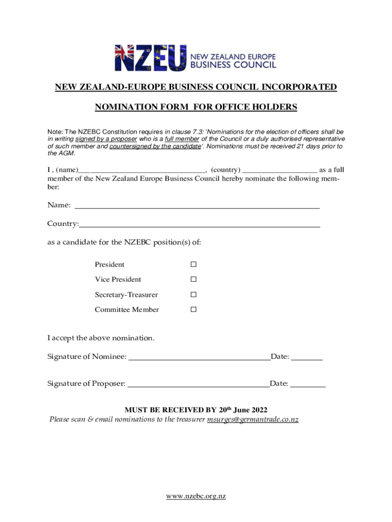 Note: The NZ EBC Constitution requires in clause 7.3: Nominations for the election of officers shall be