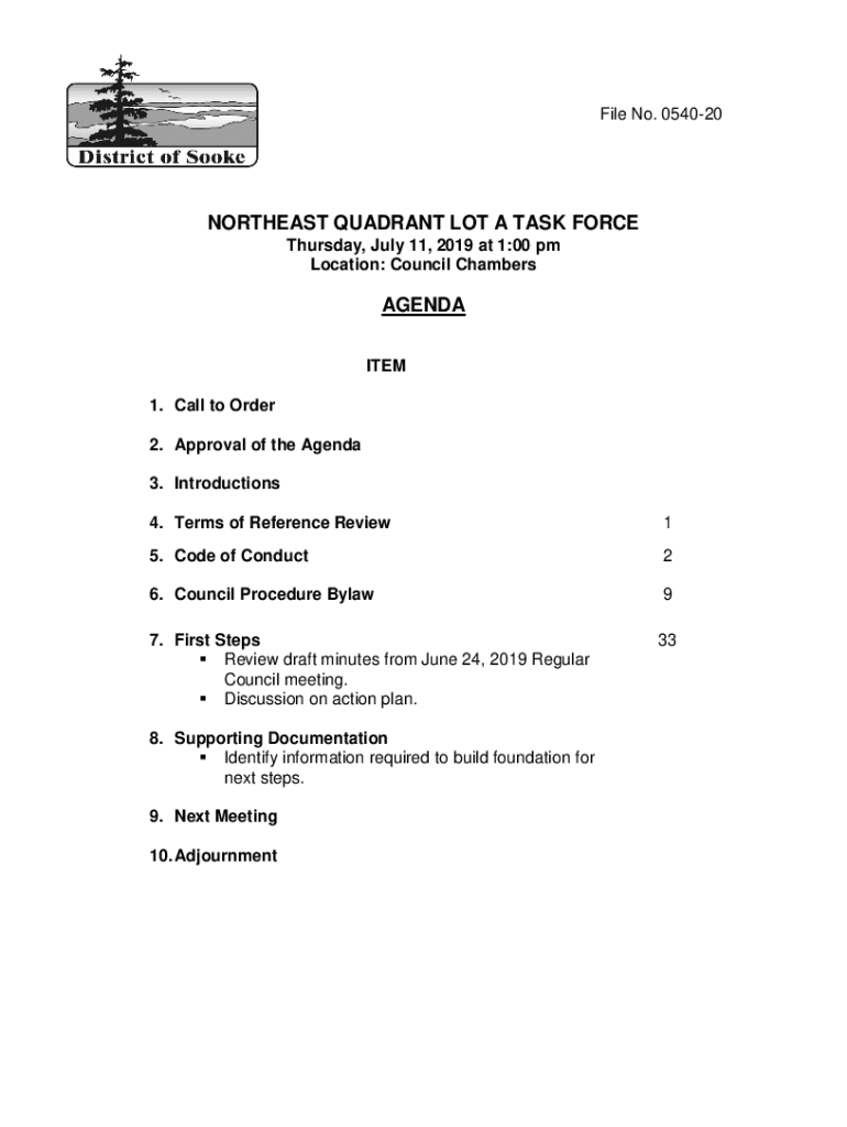 File No. 054020NORTHEAST QUADRANT LOT A TASK FORCE Thursday, July 11, 2019 at 1:00 pm Location: Council ChambersAGENDA ITEM 1. Call to Order 2. Approval of the Agenda 3. Introductions 4. Terms of