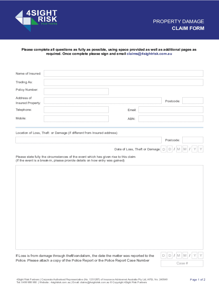 PROPERTY DAMAGE CLAIM FORMPlease complete all questions as fully as possible, using space provided as well as additional pages as required. Once complete please sign and email claims@4sightrisk.com.auName