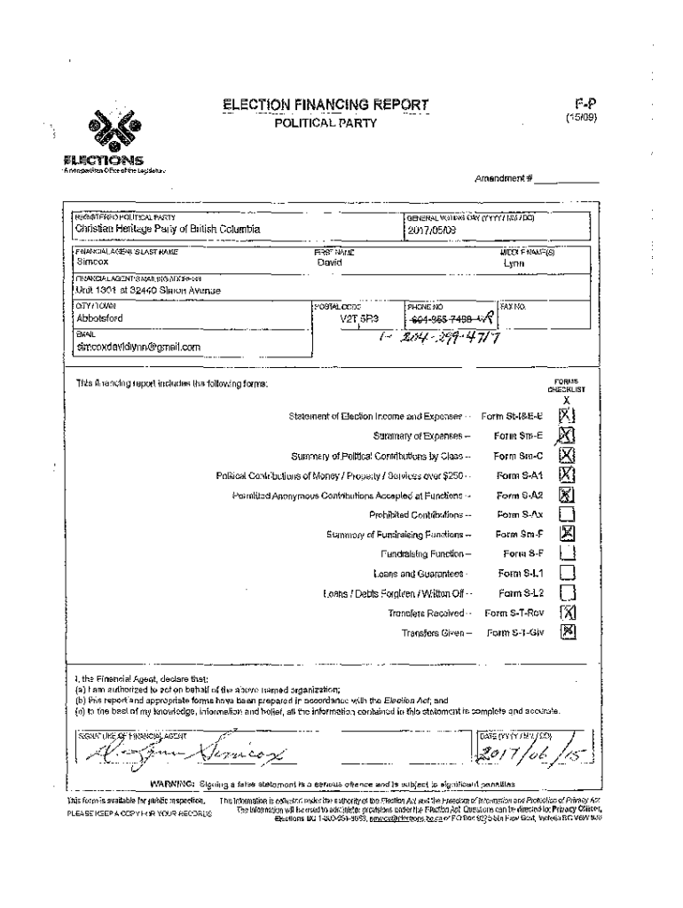 ELECTION FINANCING REPORT(15/09)POLITICAL PARTYAmendment# _ _ _ __REGISTERED POLITICAL PARTYANANll, LAGENT\'Side.FERAL VOTING OA. Y YYY I MM I 00)Christian Heritage Party of British Columbia2017/05109lAST