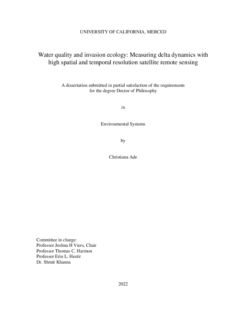 UNIVERSITY OF CALIFORNIA, MERCEDWater quality and invasion ecology: Measuring delta dynamics with