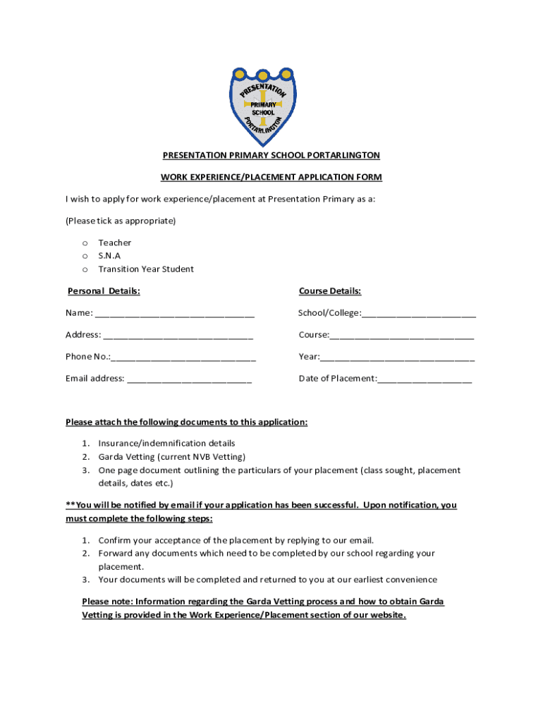 PRESENTATION PRIMARY SCHOOL PORTARLINGTON WORK EXPERIENCE/PLACEMENT APPLICATION FORM I wish to apply for work experience/placement at Presentation Primary as a: (Please tick as appropriate) o o oTeacher