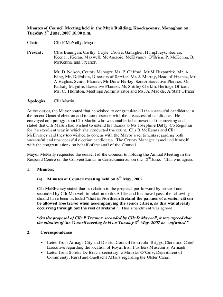 Minutes of Council Meeting held in the Meek Building, Knockaconny, Jonathan on