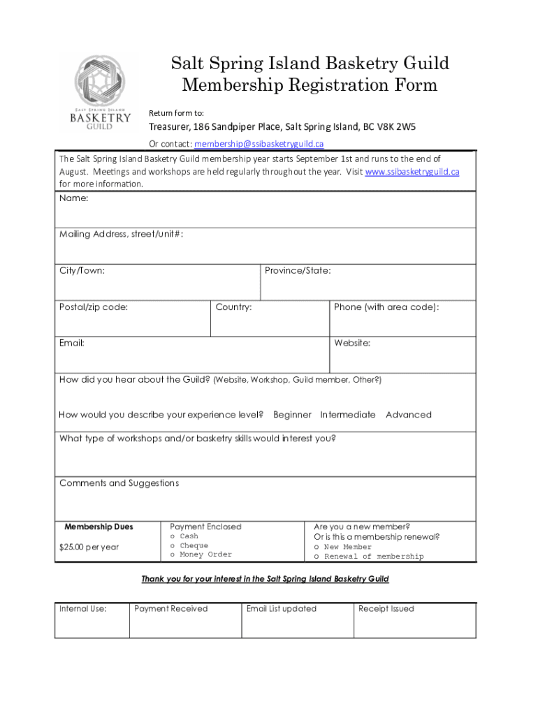 Salt Spring Island Basketry Guild Membership Registration Form Return form to:Treasurer, 186 Sandpiper Place, Salt Spring Island, BC V8K 2W5 Or contact: membership@ssibasketryguild.ca The Salt Spring