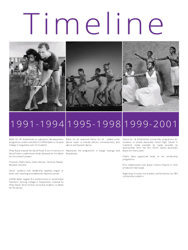 Timeline19911994 19951998 19992001 Ballet for All established as education developement programme under umbrella of CAPAB Ballet at Sivuyile College in Gugulethu with 34 Students.Ballet for All renamed