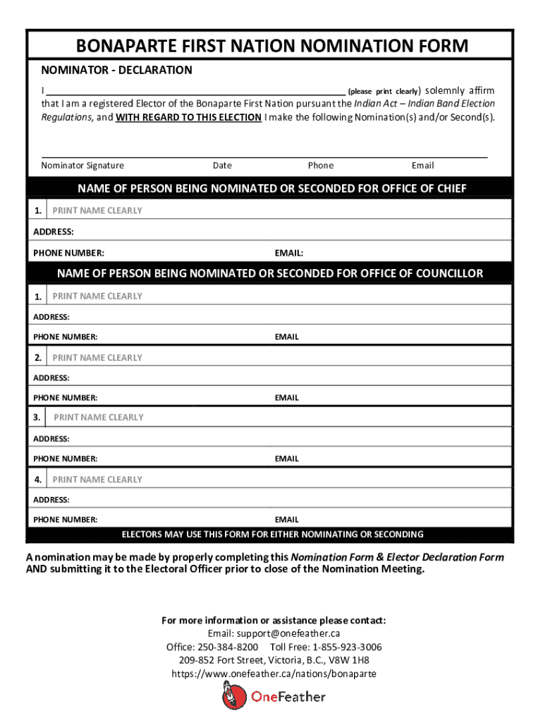 To fill out the Bonaparte First Nation nomination, candidates need to complete a nomination form, providing personal details, background information, and signatures from proposers.