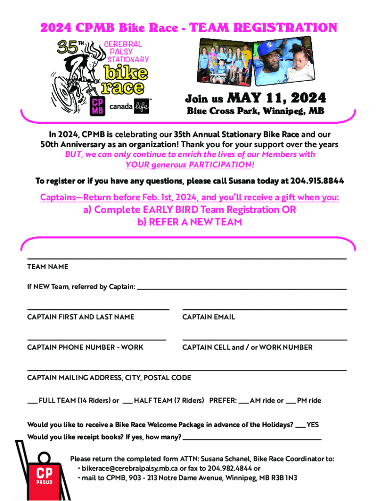 2024 CPMB Bike Race TEAM REGISTRATION CEREBRAL PALSYSTATIONARYJoin us MAY11, 2024Blue Cross Park, Winnipeg, MBIn 2024, CPMB is celebrating our 35th Annual Stationary Bike Race and our 50th Anniversary