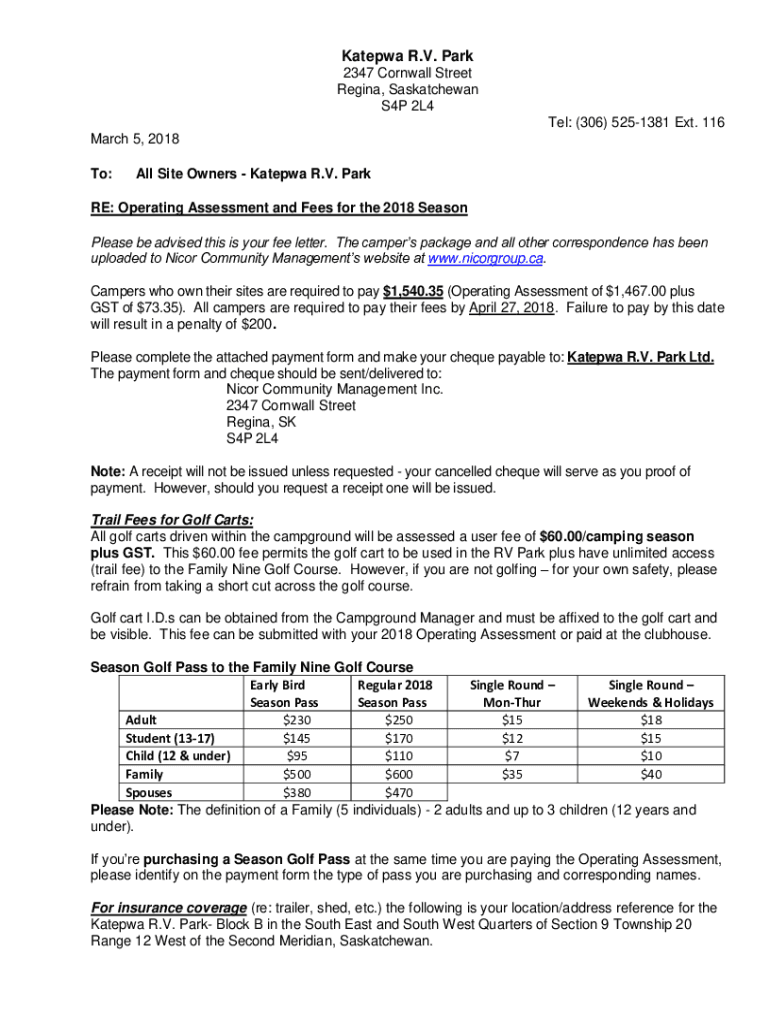 Katepwa R.V. Park 2347 Cornwall Street Regina, Saskatchewan S4P 2L4 Tel: (306) 5251381 Ext. 116 March 5, 2018 To:All Site Owners Katepwa R.V. ParkRE: Operating Assessment and Fees for the 2018 Season
