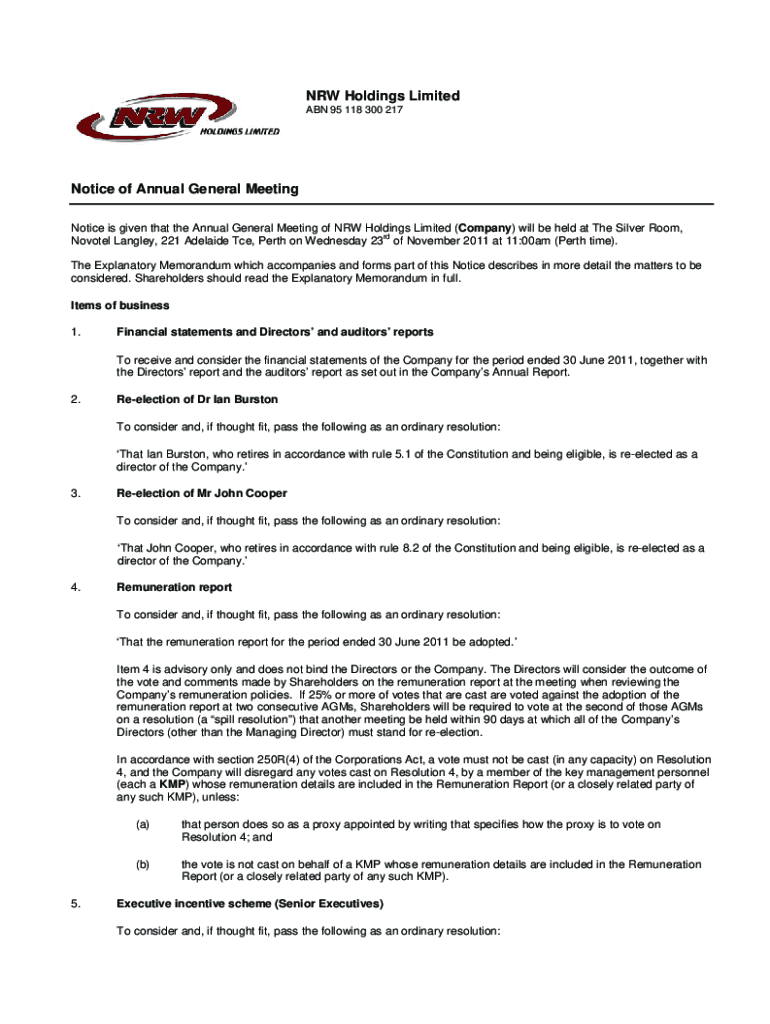 NRW Holdings Limited ABN 95 118 300 217Notice of Annual General Meeting Notice is given that the Annual General Meeting of NRW Holdings Limited (Company) will be held at The Silver Room, rd Novotel