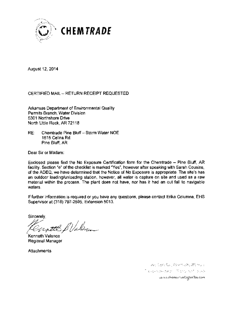 CHEM TRADEAugust 12, 2014CERTIFIED MAIL RETURN RECEIPT REQUESTEDArkansas Department of Environmental Quality Permits Branch, Water Division 5301 Northshore Drive North Little Rock, AR 72118 RE:Chemtrade