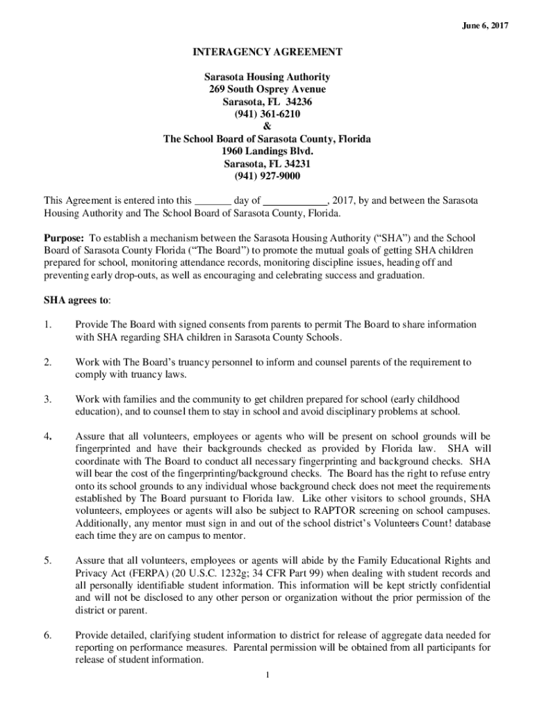 June 6, 2017INTERAGENCY AGREEMENT Sarasota Housing Authority 269 South Osprey Avenue Sarasota, FL 34236 (941) 3616210 & The School Board of Sarasota County, Florida 1960 Landings Blvd. Sarasota, FL