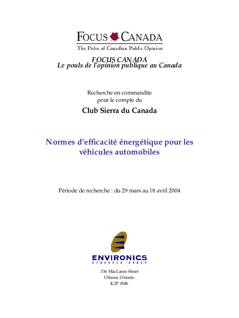 FOCUS CANADA Le pouls de lopinion publique au CanadaRecherche en commandite pour le compte duClub Sierra du CanadaNormes defficacit nergtique pour les vhicules automobilesPriode de recherche : du