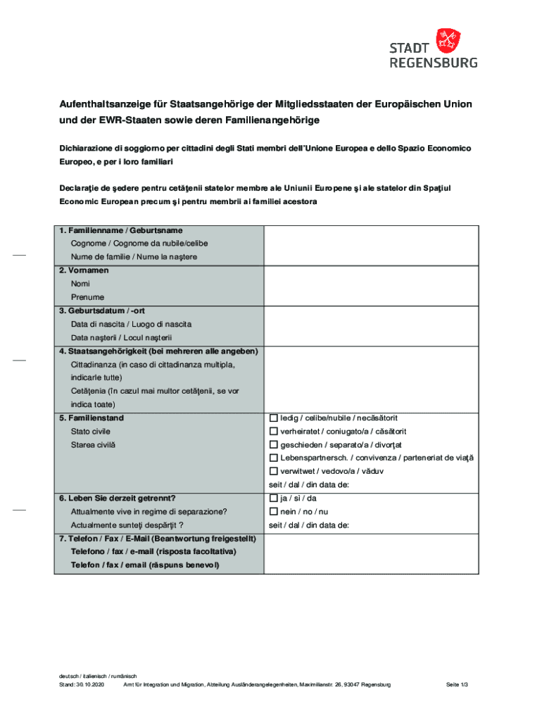 Holen Sie sich kostenlos Aufenthaltsanzeige fr Staatsangehrige der Mitgliedsstaaten der Europisch...