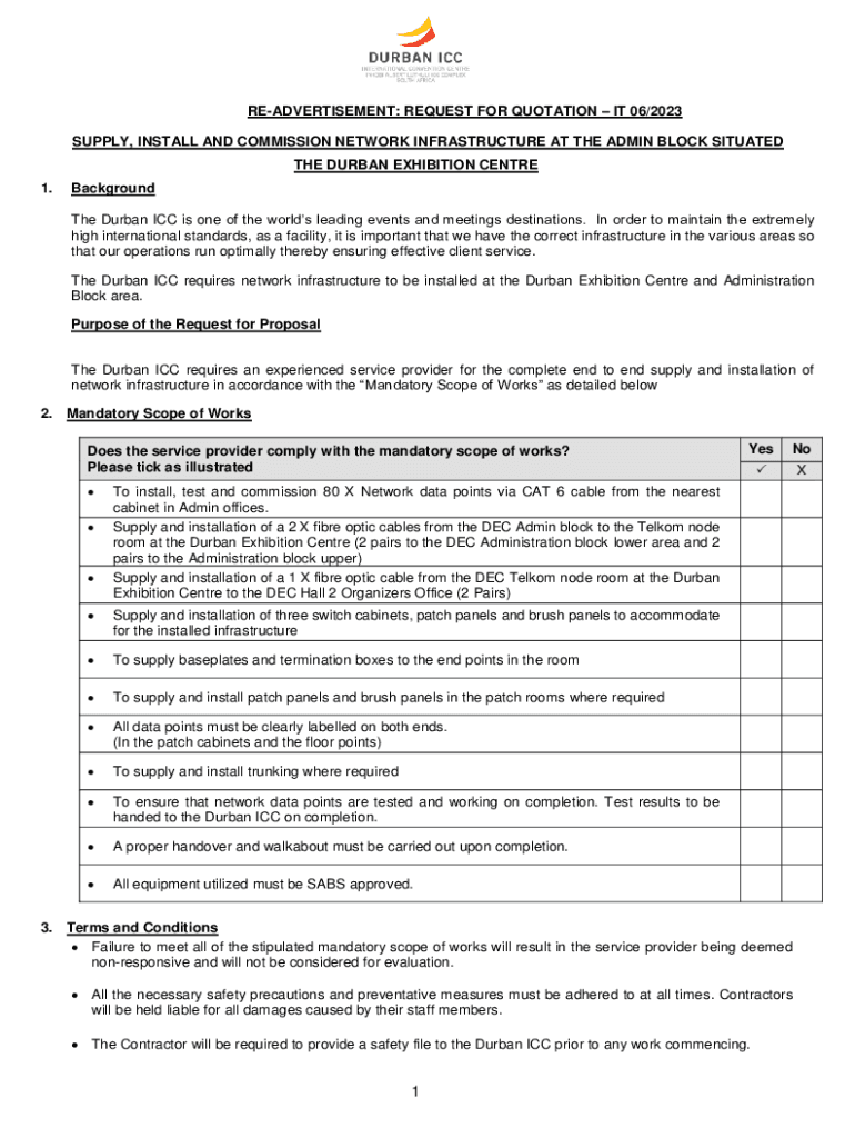 READVERTISEMENT: REQUEST FOR QUOTATION IT 06/2023 SUPPLY, INSTALL AND COMMISSION NETWORK INFRASTRUCTURE AT THE ADMIN BLOCK SITUATED THE DURBAN EXHIBITION CENTRE 1.Background The Durban ICC is one