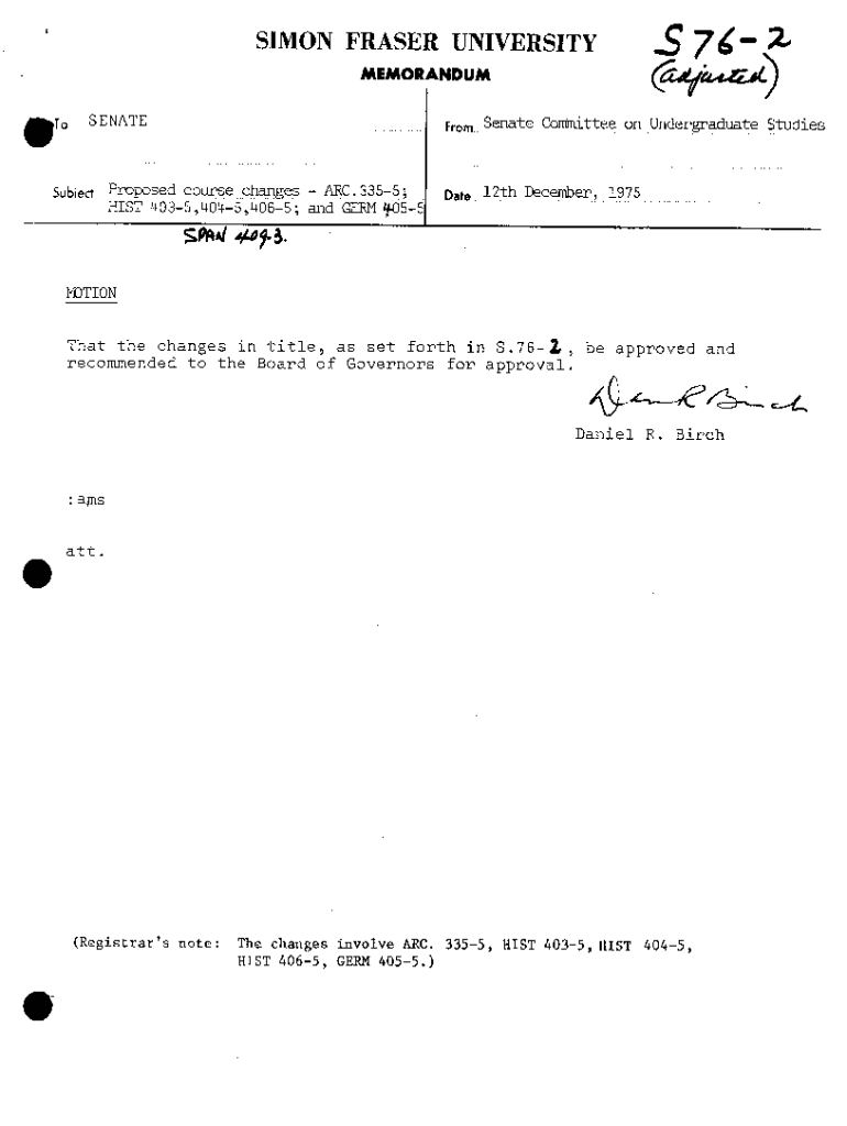 Simon FRASER UNIVERSITYS7MEMORANDUMTo SENATE. Subject Proposed course changes ARC. 3355;HIST 403_5,404_5,406_5; and GERM 055From. SenateCommittee on Undergraduate StudiesDate 12th December, 1975MJTION