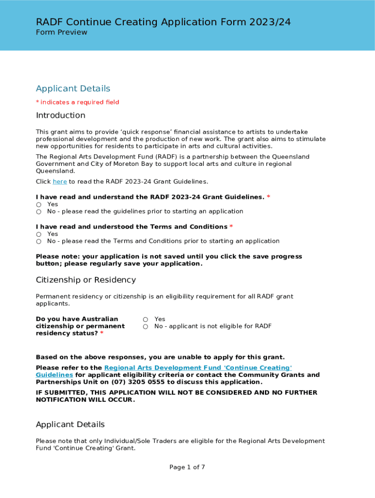 The RADF (Regional Arts Development Fund) continue creating application is a process through which artists and organizations can apply for funding to support ongoing creative projects that contribute to the cultural development of a community.