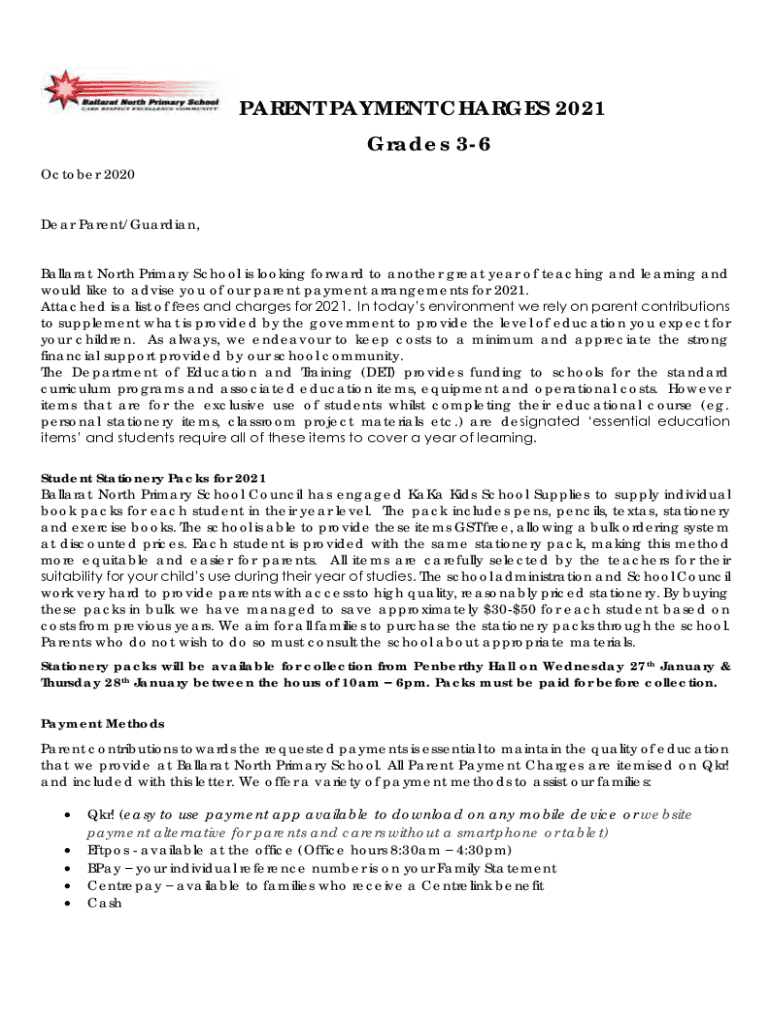 October 2020Dear Parent/Guardian, Ballarat North Primary School is looking forward to another great year of teaching and learning and