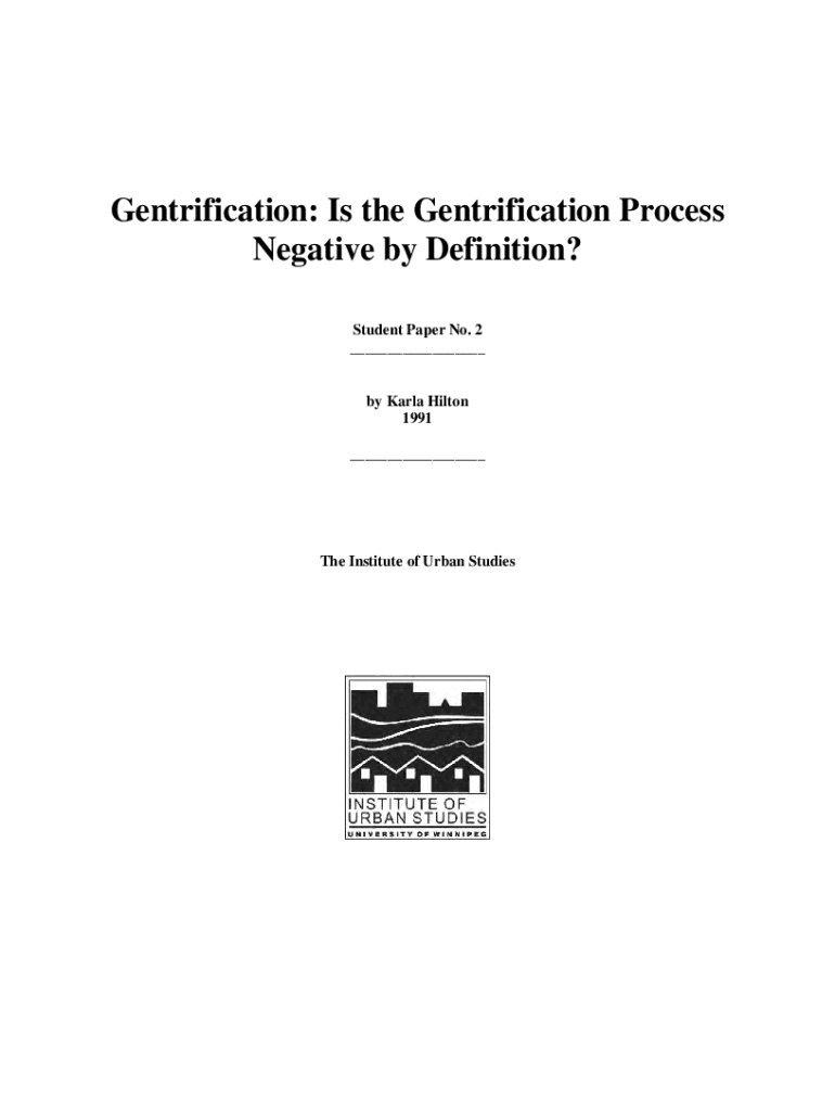 Gentrification: Is the Gentrification Process Negative by Definition? Student Paper No. 2 ___by Karla Hilton 1991 ___The Institute of Urban StudiesFOR INFORMATION: The Institute of Urban Studies The