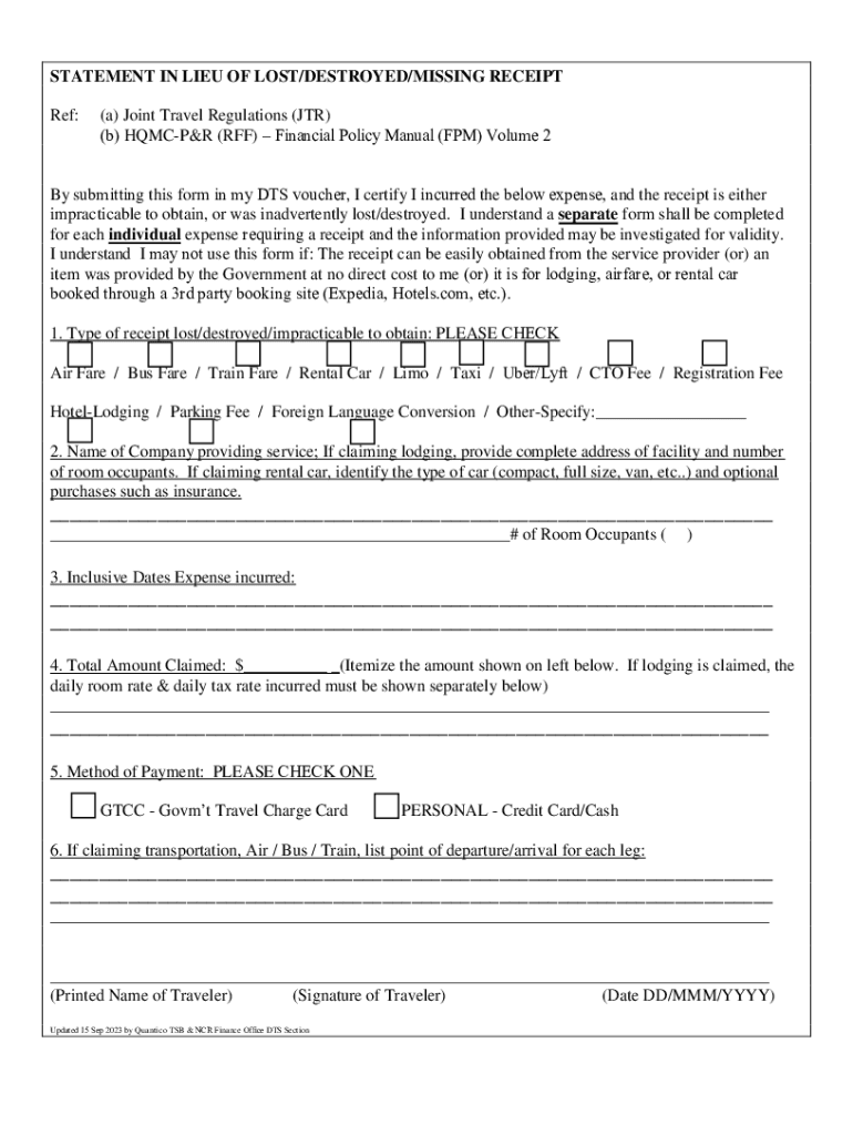 Get the free STATEMENT IN LIEU OF ACCEPTABLE LODGING RECEIPT