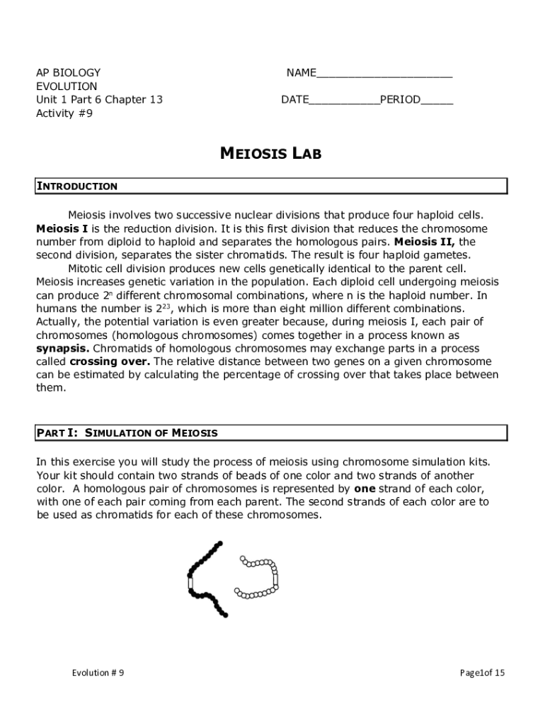 AP BIOLOGY EVOLUTION Unit 1 Part 6 Chapter 13 Activity #9NAME___ DATE___PERIOD___MEIOSIS LAB INTRODUCTION Meiosis involves two successive nuclear divisions that produce four haploid cells. Meiosis