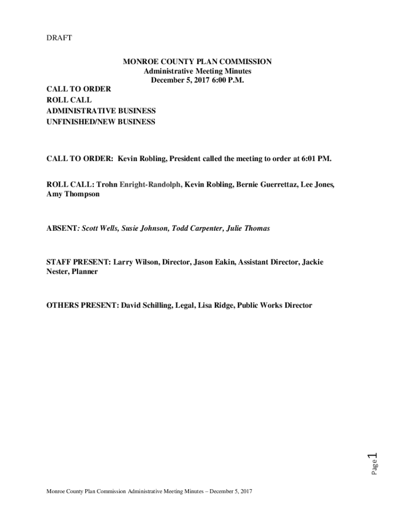 DRAFT MONROE COUNTY PLAN COMMISSION Administrative Meeting Minutes December 5, 2017 6:00 P.M. CALL TO ORDER ROLL CALL ADMINISTRATIVE BUSINESS UNFINISHED/NEW BUSINESSCALL TO ORDER: Kevin Robling, President