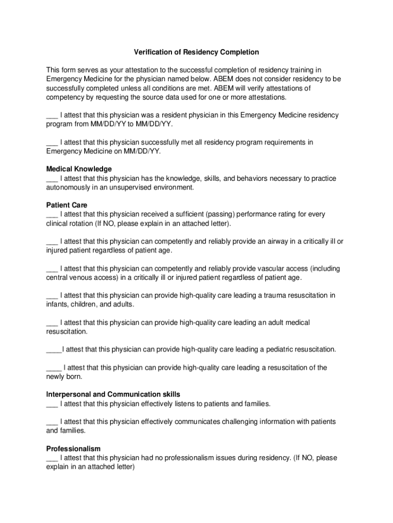 Verification of Residency Completion This form serves as your attestation to the successful completion of residency training in Emergency Medicine for the physician named below. ABEM does not consider