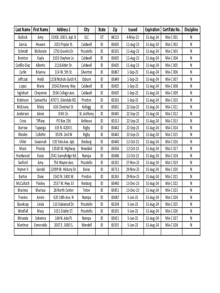 Get the free Last Name First Name Address 1 City State Zip Issued ...