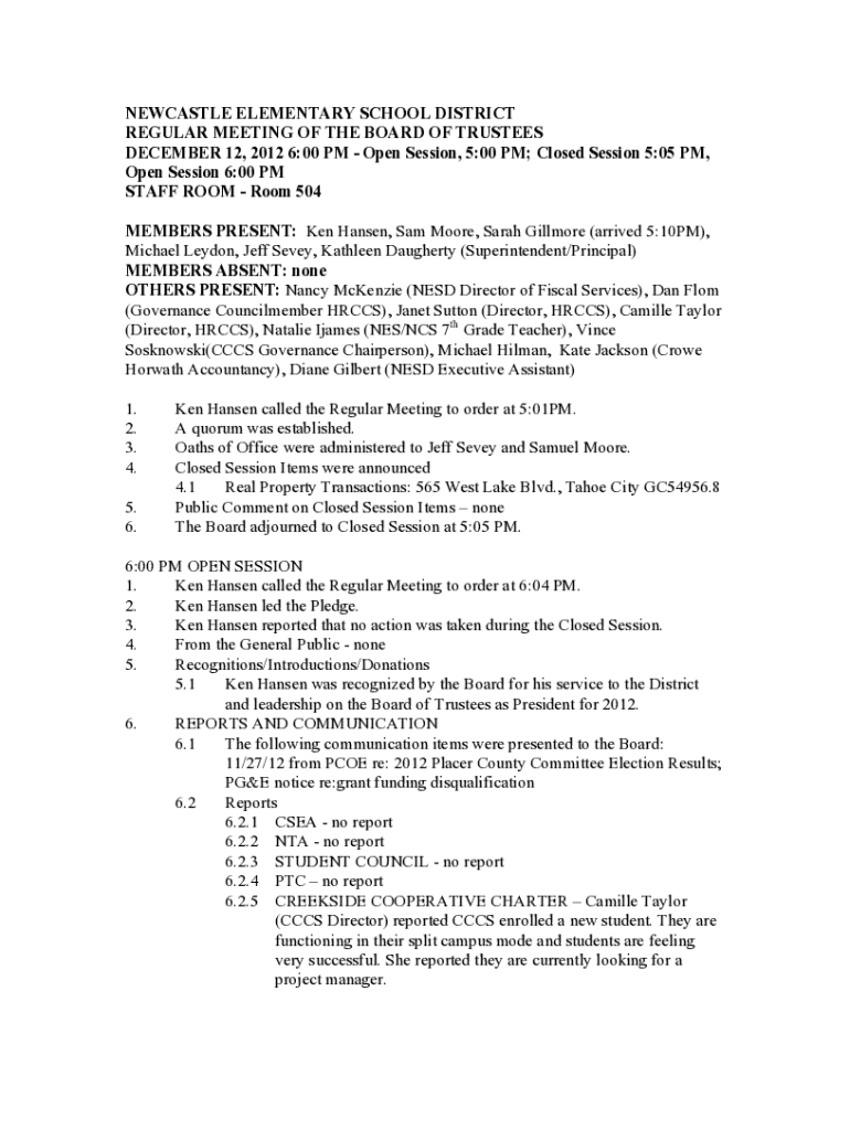 NEWCASTLE ELEMENTARY SCHOOL DISTRICT REGULAR MEETING OF THE BOARD OF TRUSTEES DECEMBER 12, 2012 6:00 PM Open Session, 5:00 PM; Closed Session 5:05 PM, Open Session 6:00 PM STAFF ROOM Room 504 MEMBERS