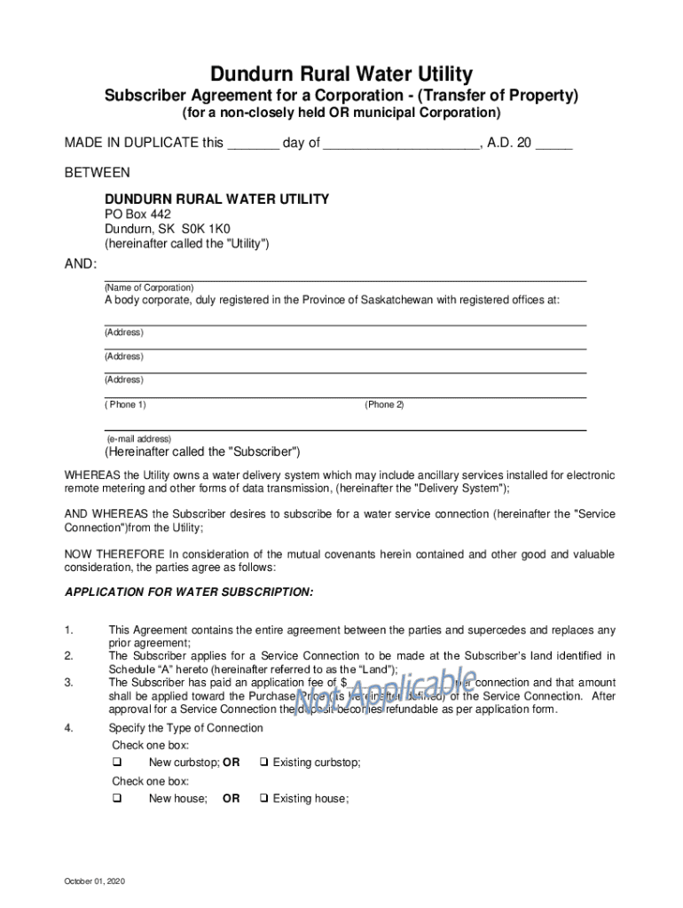 Dundurn Rural Water Utility Subscriber Agreement for a Corporation (Transfer of Property) (for a nonclosely held OR municipal Corporation) MADE IN DUPLICATE this ___ day of ___, A.D. 20 ___ BETWEEN