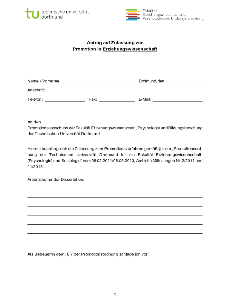 Antrag auf Zulassung zur Promotion in ErziehungswissenschaftName / Vorname: ___Dortmund, den ___Anschrift: ___ Telefon: ___ Fax: ___ EMail: ___An den Promotionsausschuss der Fakultt Erziehungswissenschaft,