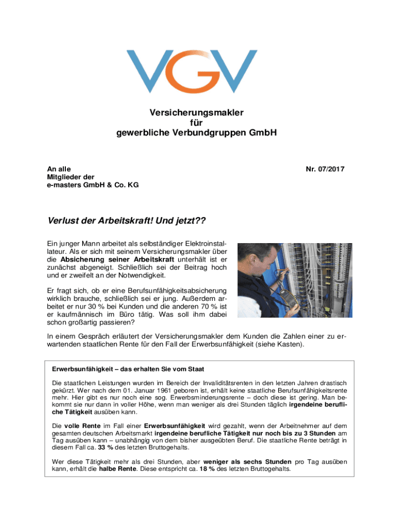 Versicherungsmakler fr gewerbliche Verbundgruppen GmbHAn alle Mitglieder der emasters GmbH & Co. KGNr. 07/2017Verlust der Arbeitskraft! Und jetzt?? Ein junger Mann arbeitet als selbstndiger Elektroinstallateur.