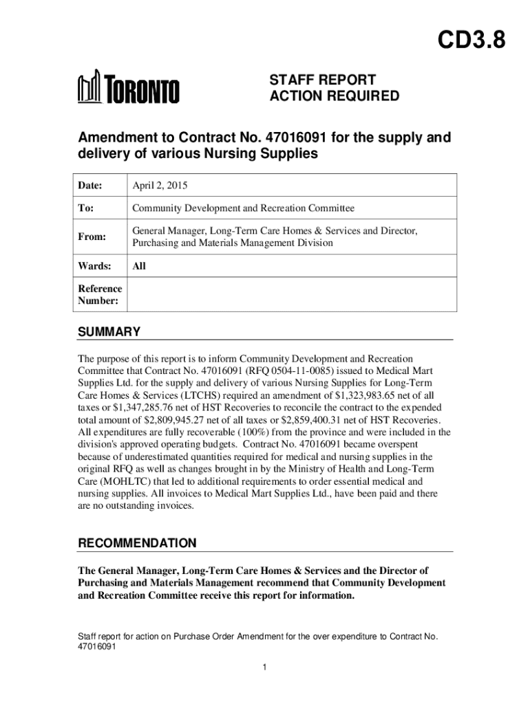 CD3.8 STAFF REPORT ACTION REQUIRED Amendment to Contract No. 47016091 for the supply and delivery of various Nursing Supplies Date:April 2, 2015To:Community Development and Recreation CommitteeFrom:General