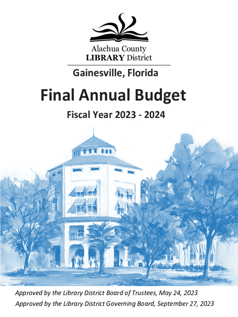 Alachua County LIBRARY DistrictGainesville, FloridaFinal Annual Budget Fiscal Year 2023 2024 Annual BudgetApproved by the Library District Board of Trustees, May 24, 2023 Approved by the Library District