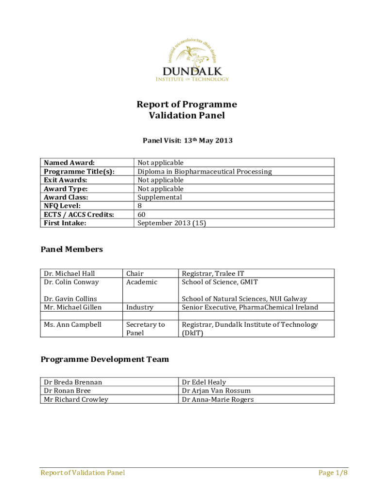 Report of Programme Validation Panel Panel Visit: 13th May 2013 Named Award: Programme Title(s): Exit Awards: Award Type: Award Class: NFQ Level: ECTS / ACCS Credits: First Intake:Not applicable Diploma