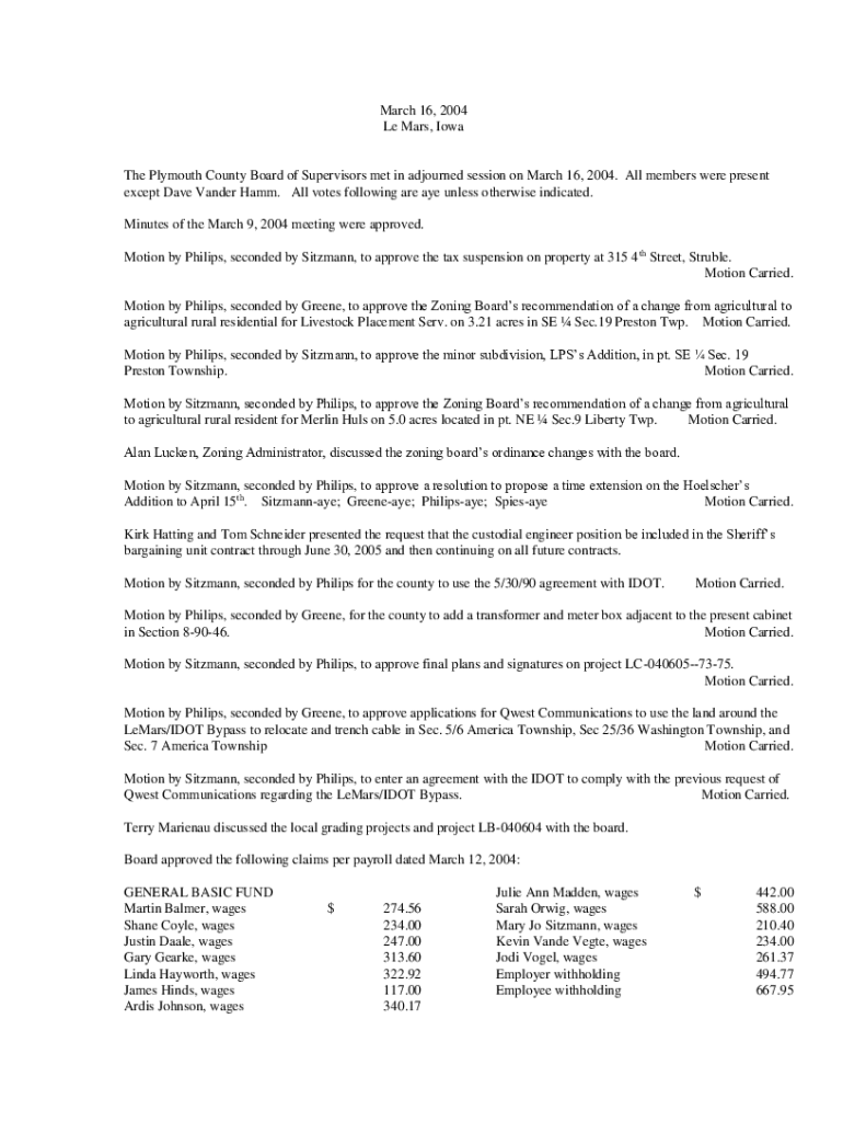 March 16, 2004 Le Mars, IowaThe Plymouth County Board of Supervisors met in adjourned session on March 16, 2004. All members were present except Dave Vander Hamm. All votes following are aye unless