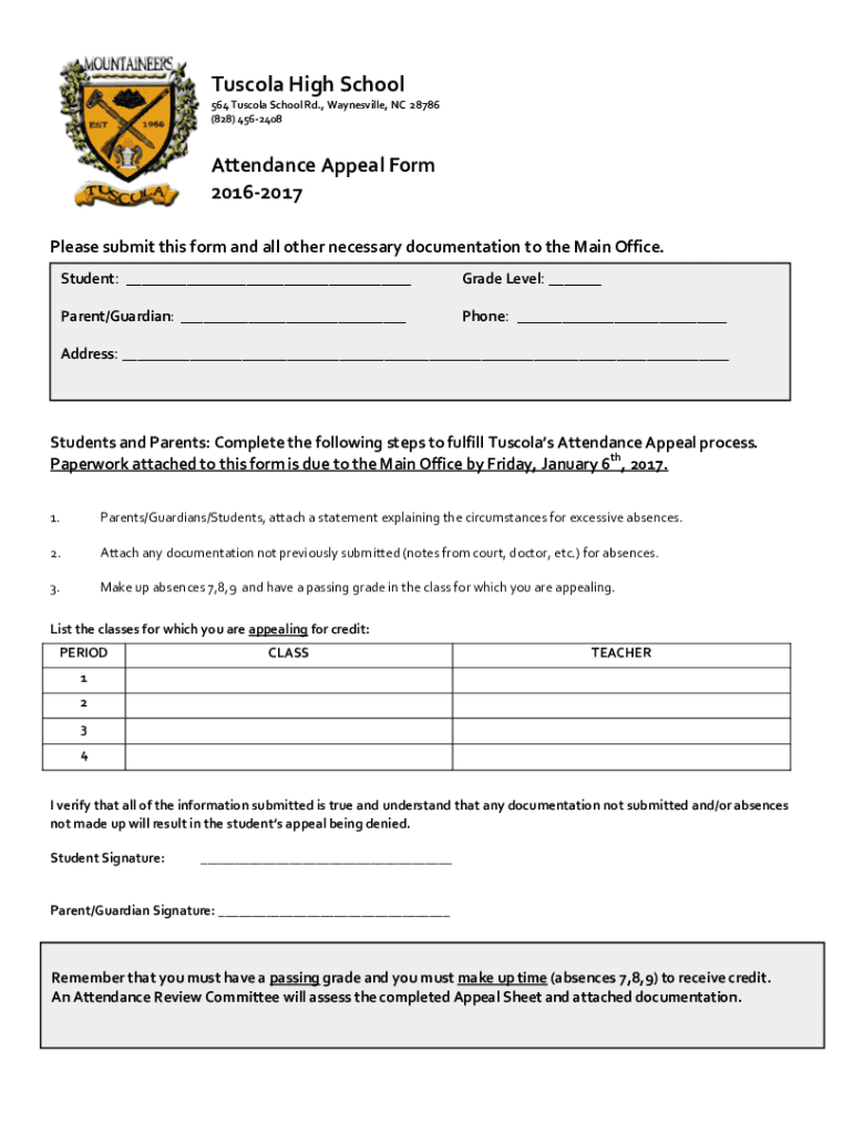 Tuscola High School 564 Tuscola School Rd., Waynesville, NC 28786 (828) 4562408Attendance Appeal Form 20162017 Please submit this form and all other necessary documentation to the Main Office. Student: