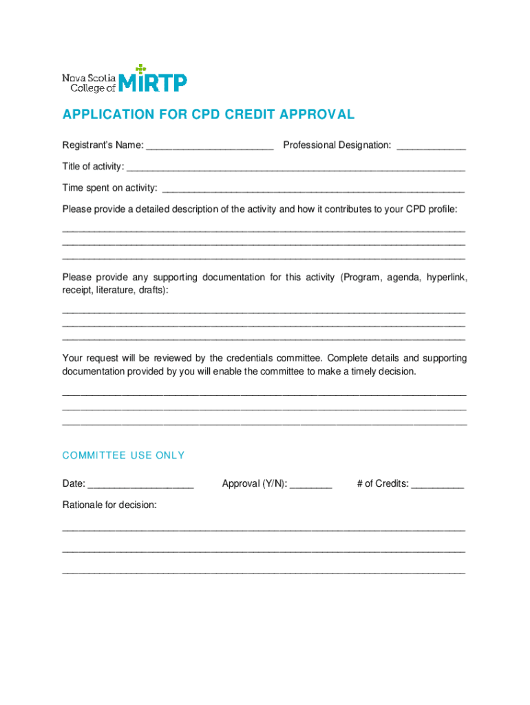 APPLICATION FOR CPD CREDIT APPROVAL Registrants Name: ___Professional Designation: ___Title of activity: ___ Time spent on activity: ___ Please provide a detailed description of the activity and how