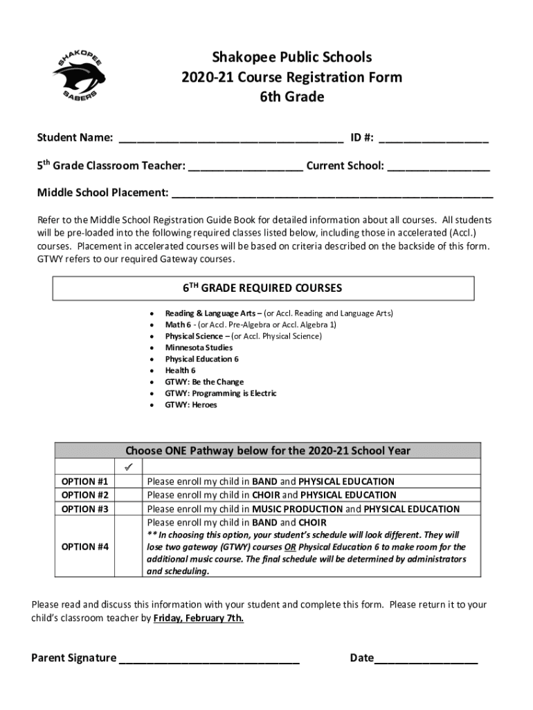 Shakopee Public Schools 202021 Course Registration Form 6th Grade Student Name: ___ ID #: ___ 5th Grade Classroom Teacher: ___ Current School: ___ Middle School Placement: ___ Refer to the Middle