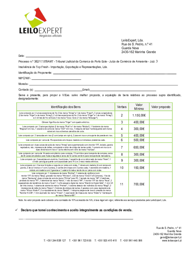 LeiloExpert, Lda. Rua de S. Pedro, n. 41 Guarda Nova 2430162 Marinha GrandeData: ___Processo n. 382/17.5T8AMT Tribunal Judicial da Comarca do Porto Este Juzo de Comrcio de Amarante Juz3Insolvncia