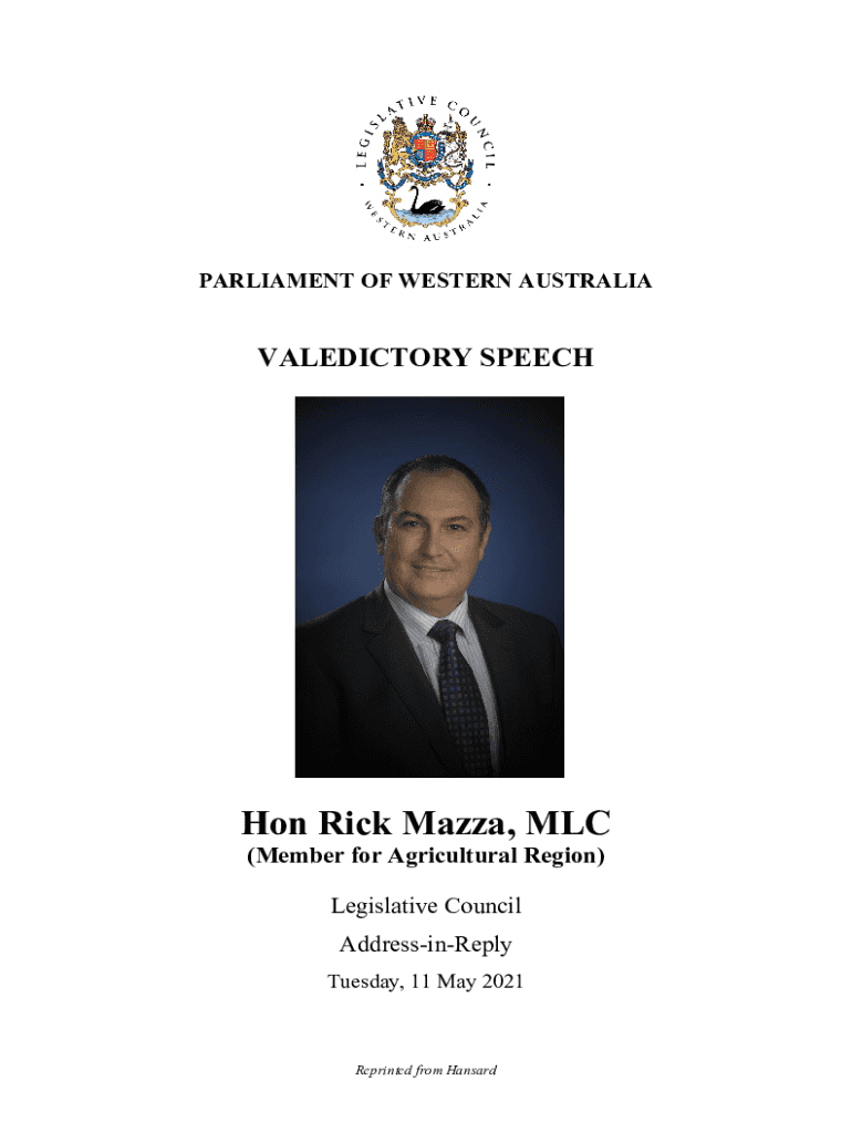 PARLIAMENT OF WESTERN AUSTRALIAVALEDICTORY SPEECHHon Rick Mazza, MLC (Member for Agricultural Region) Legislative Council AddressinReply Tuesday, 11 May 2021Reprinted from HansardLegislative Council